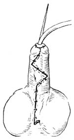4.封闭创面 按Z成形原则调整阴茎和阴囊部皮肤,缝合成锯齿状[图2 ⑶]。阴囊切口底端置胶皮片引流条。助手轻轻前提导尿管使阴茎呈伸直位,术者用碘仿凡士林纱布缠绕阴茎后,厚层敷料加压包扎[图2