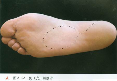 以足底外侧动脉为蒂的趾短屈肌肌(皮)瓣,位于跖骨头与足跟之间足底非负重区,切取范围大,用于修复较大范