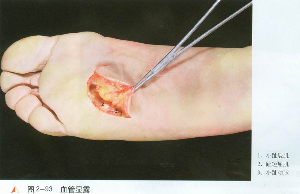 切断、结扎至小趾的趾动脉[1],并以该血管为向导向近侧追踪解剖即可找到足底外侧