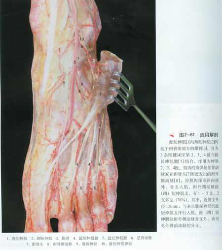 支是趾短伸肌的主要血管蒂,必须加以保护;③跗外侧动脉外径较小,常截取足背动脉为移植用的血管束;④腓深神经