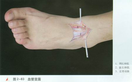 两肌之间的足背动静脉[3],寻找起丁足背动脉走向趾短伸肌深面的跗外侧动脉。