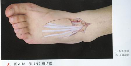 腱抽出(切取肌皮瓣后再予缝合)。将切断的趾短伸肌与皮缘缝合。沿足背动脉向远侧解剖