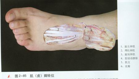 大增加血管蒂长度,使趾短伸肌肌(皮)瓣可修复膝、小腿、踝及足跟部软组织缺损。趾短伸肌切取后对功能影响较小,