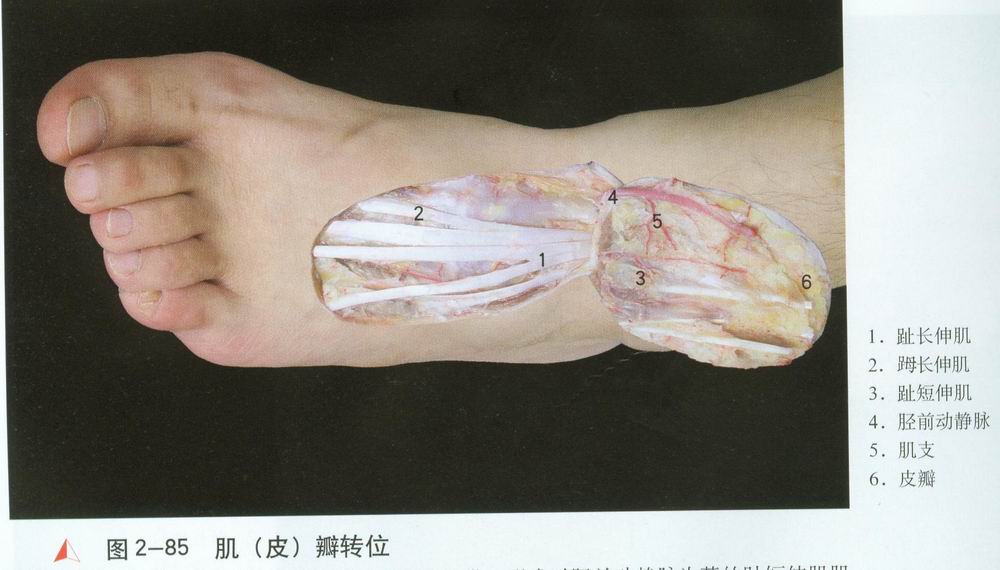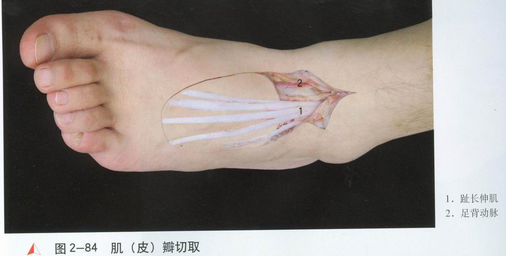 按设计切开足背皮肤,在皮瓣远侧切断趾长[1]、短伸肌腱,并从近侧切口将趾长伸肌