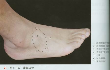 足外侧皮瓣位于足背外侧面,皮质地好,以附外侧动脉为主要供血,是邻近转位修复外踝、跟腱、足背和足底创伤的理想供区。逆行用于前足皮肤缺损的修复。