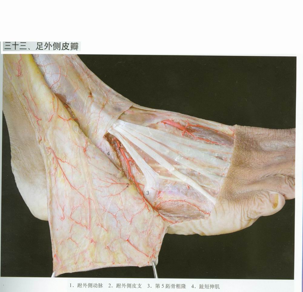 前行支和后行支两终支。在踝间连线下2.6cm处足背动脉搏动点至第5跖骨底连线相当于跗外侧血管的体表投影。跗外侧动脉沿途除发出外径0.2—0.7mm的肌支至坶短伸肌、趾短伸肌和骨膜支至骰骨外,还发出直接皮动脉和肌皮动脉穿支。直接皮动脉,进入深筋膜,并浅出至皮下。肌皮动脉穿支,垂直穿过趾短伸肌达深筋膜,并浅出至皮下,其外径0.3—0.7mm,长0.8—1.2cm。直接皮动脉在跗外侧动脉体表投影线上距足背动脉1.2cm处,肌皮动脉穿支在跗外侧动脉体表投影线上距足背动脉2.7cm处。