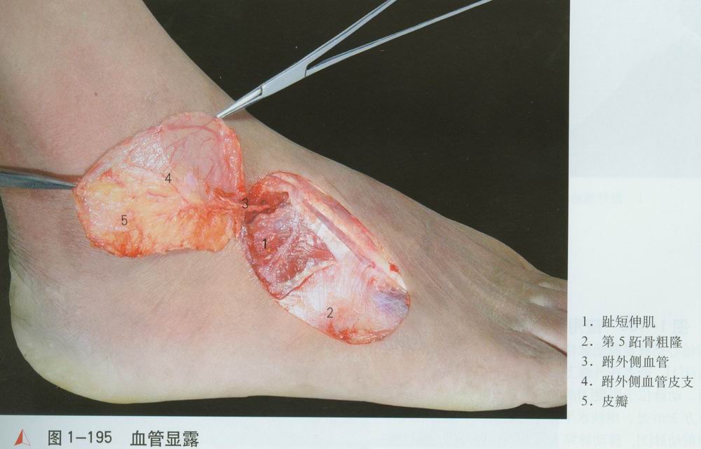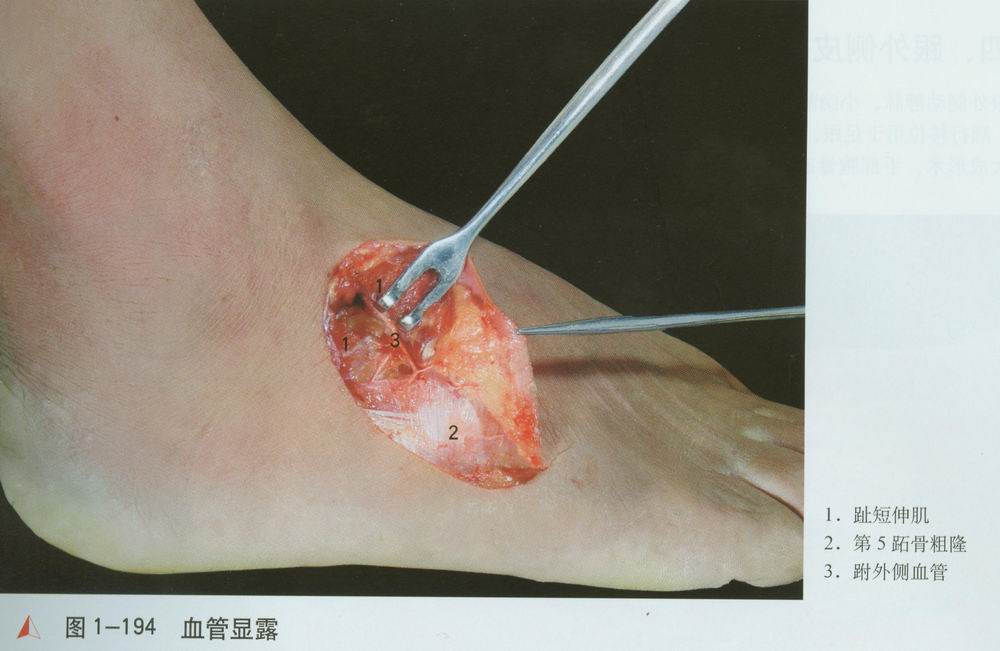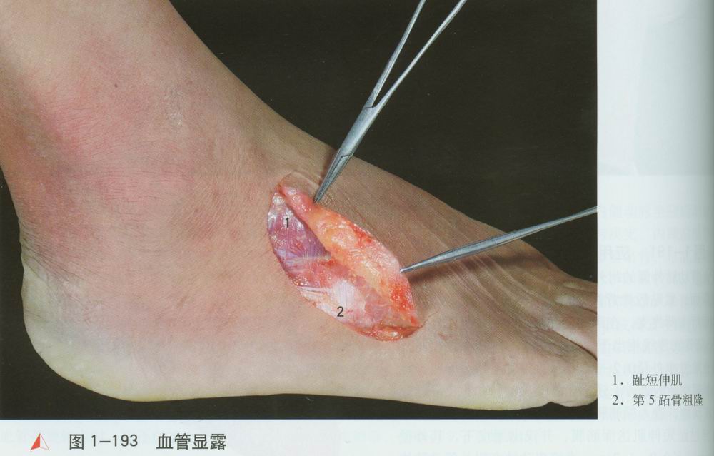 跟骨前方切断趾短伸肌[1],翻向远侧,即可显露跗外侧血管[2]。