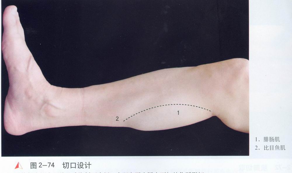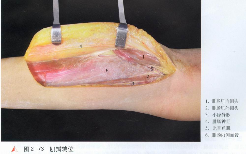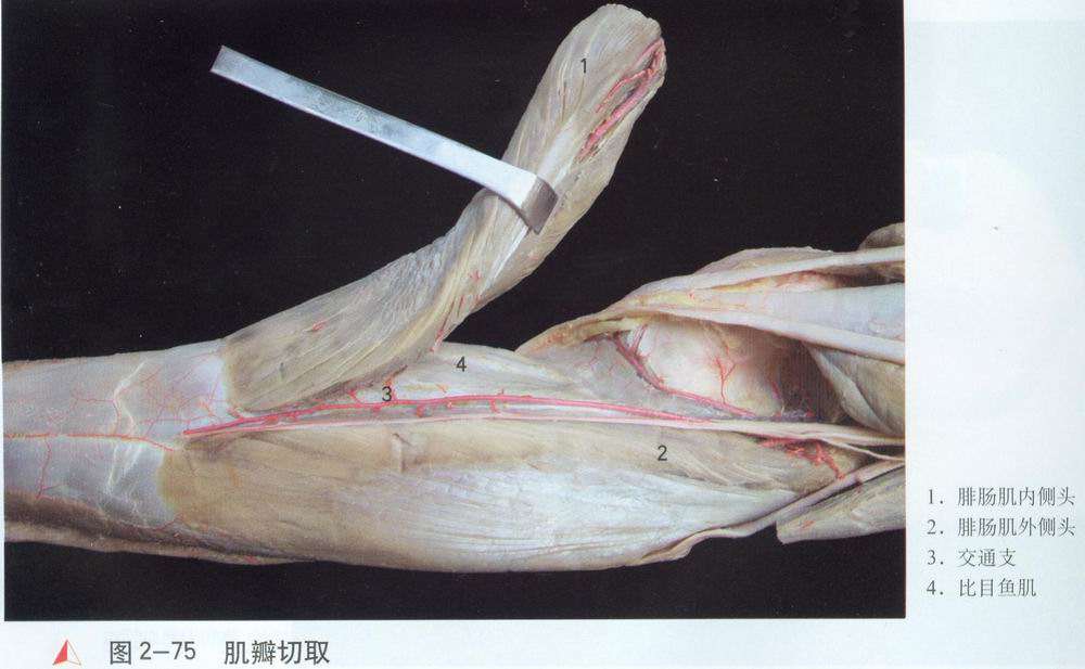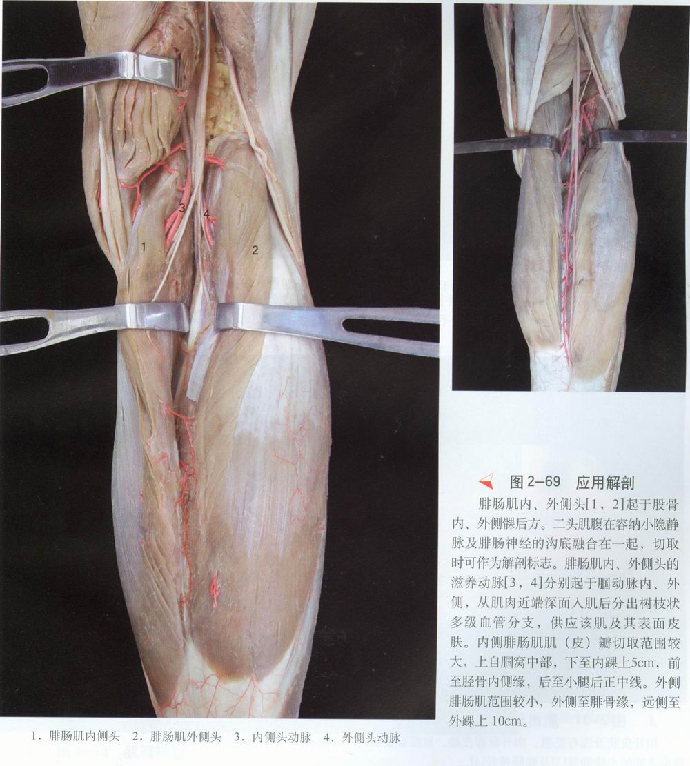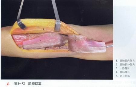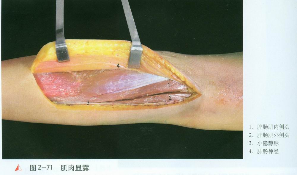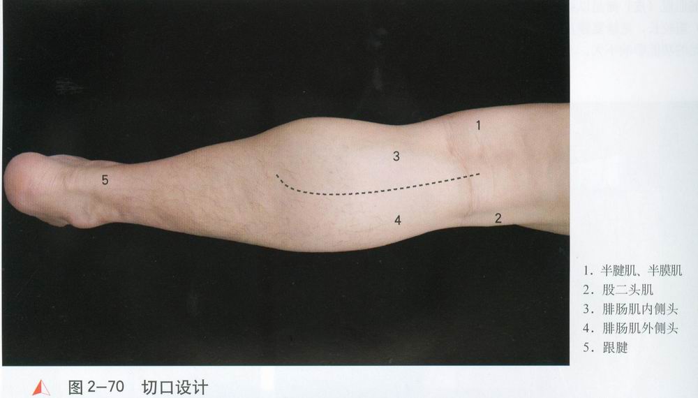 经[2],将两者牵向外侧保护。根据腓肠肌肌纤维走向,辨清内、外侧头及其肌间隙。