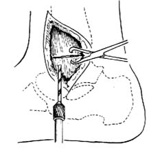 ⑴拉开跟腱,显露屈 长肌(插图示切口) |
