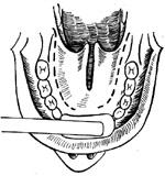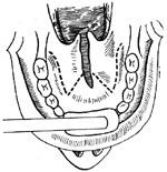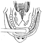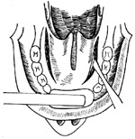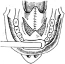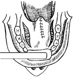 在确定钩突的位置后,用小骨凿插入,顶住钩突的颈部予以凿断。这样腭帆张肌的紧张力即可减轻。用剥离器插入创口边分离,边将软腭组织推向中央,直至软腭部已松弛为止,如仍有若干组织拉紧,可再进行钝性分离。软组织渗血,可用浸有1∶1000肾上腺素液的沙条压迫止血。