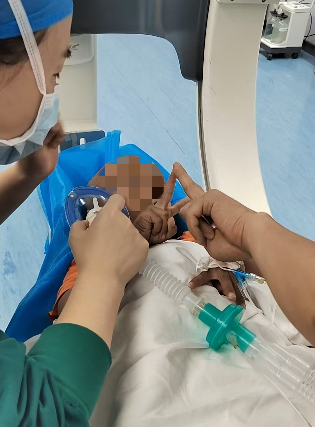 琪琪(化名)是一名贵州的4岁小朋友,因间断头痛伴肢体乏力两周在爸爸妈妈的陪同下来我院治疗,CT检查提示:颅内占位性病变,为了进一步明确病因,拟于今日在全身麻醉下行脑血管造影检查术。当琪琪小小的身躯躺在介入手术室的手术床上,他的眼神中满是恐惧和迷茫,紧紧抓着妈妈的手不肯松开。我们手术室里的医护人员微笑着迎上前,俯身轻声安慰道:“宝贝儿,你叫什么名字呀?你还记得我吗?”。他紧紧的盯着我不说话。“那我们自我介绍一下,重新认识一下好吗?我姓杨,你可以叫我小杨阿姨或小杨姐姐好不好?我家有个哥哥哦,等你检查完,我们去跟哥哥玩好不好?哥哥有很多很多玩具,有小汽车、大货车、挖挖机、还有飞机哦。那我们握个手好不好?” 琪琪轻轻的松开妈妈的手,小小手指微微的动了一下,还是没有抬起来,我轻轻地握住小朋友的小手,我们的手间仿佛传递着无尽的力量,他紧张的表情微微放松了些许。这时,麻醉医生走了过来,附身站在琪琪的对面,手轻轻的抚摸着他的头:“小琪琪你好,我是负责麻醉的眼镜叔叔,我们昨天下午见过面的哦!你看我是戴着黑框框眼镜的叔叔,你还记得我吗?” 琪琪目不转睛的打量着叔叔,嘴巴微微动了一动,仍未说话。叔叔瞧着琪琪手上的腕带,“耶,你这个是什么呀?我都没有,我可以看看吗?” 琪琪微微点了一下头,手术室里的医生护士们不停跟他说话,安抚着琪琪,他忘记了妈妈早已悄悄离开。随着医护人员指尖温度与力量的传递,他缓缓闭上眼睡着了。