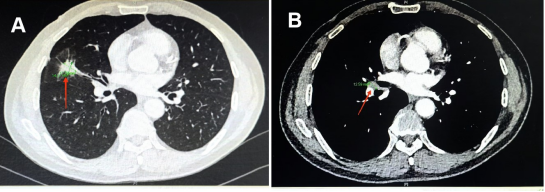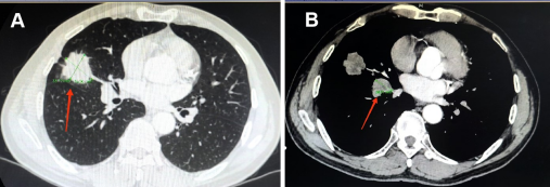 图2 向先生治疗前的CT,原发肿瘤近4cm(见图A红色箭头)和肺门转移淋巴结(见图B红色箭头)