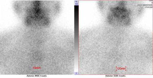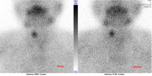 亲肿瘤显像异常图像(甲状腺癌术后残留少许甲状腺组织显影):
