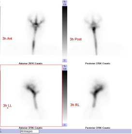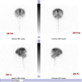 显像方法:患者取卧位,无菌条件下行腰椎穿刺,收集缓慢流出的脑脊液稀释显像剂(99mTc-DTPA)至2~3ml,后将显像剂缓慢、匀速地注入蛛网膜下隙内,可再次抽取脑脊液2ml并注入蛛网膜下隙,反复2~3次。拔出穿刺针后包扎固定。注入显像剂后1、3、24小时分别做头部前、后、侧位显像,必要时做48、72小时SPECT显像。。