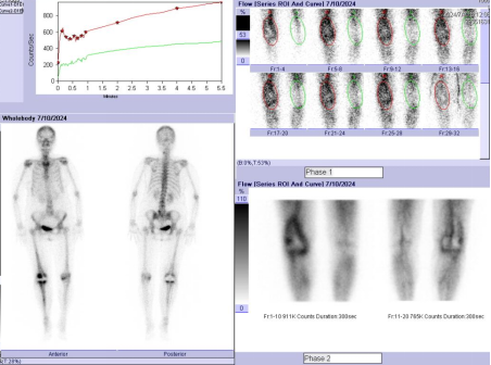 骨三时+全身骨静态显像异常图像(考虑右侧人工膝关节感染可能):