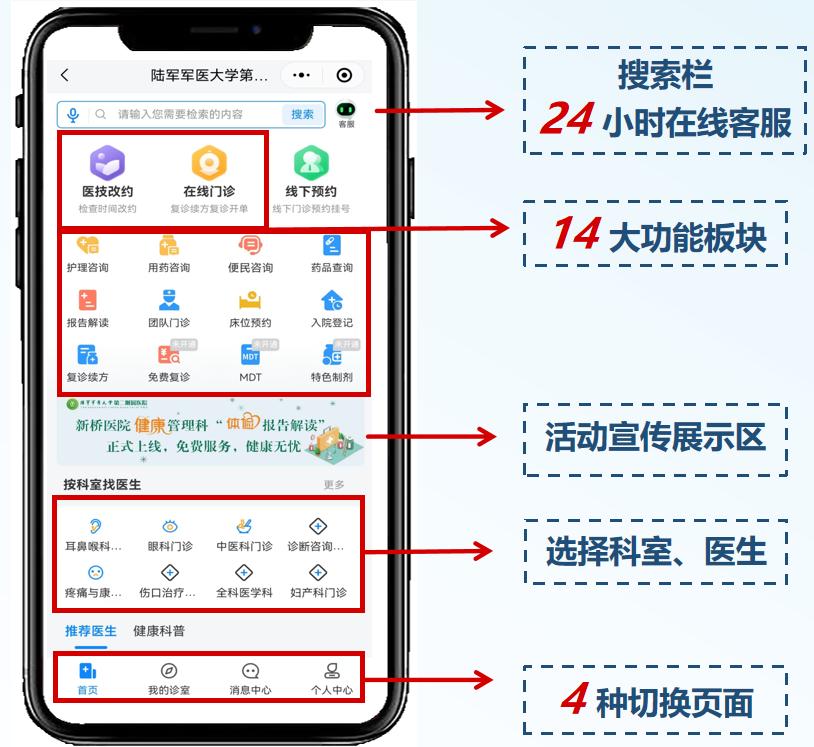 首页最上端是搜索栏及24小时客服,时时为患者提供服务。中部为活动宣传展示区,滚动播放限时活动,下方患者可选择具体科室及医生,最下端4种切换页面满足患者不同需求。