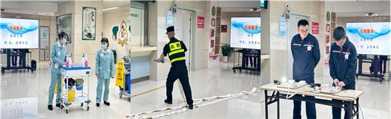 此次竞赛,通过情景模拟还原了工作中常出现的安全隐患问题。保洁人员在时刻巡视地面清洁、主动打扫、正确手消毒、正确戴脱手套、规范处置污物的同时,设置警示标识,避免患者跌倒风险;安保人员发现火情迅速响应,通过正确判断,快速安装消防设备,及时灭火,避免火灾蔓延;后勤工程师们在突遇电路故障,灯泡不亮的情况下,立即现场操作组装,熟练快速且高效的连接线路,及时恢复光亮,确保了室内照明的正常运行。