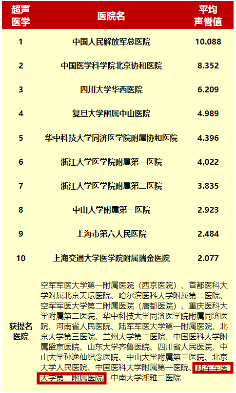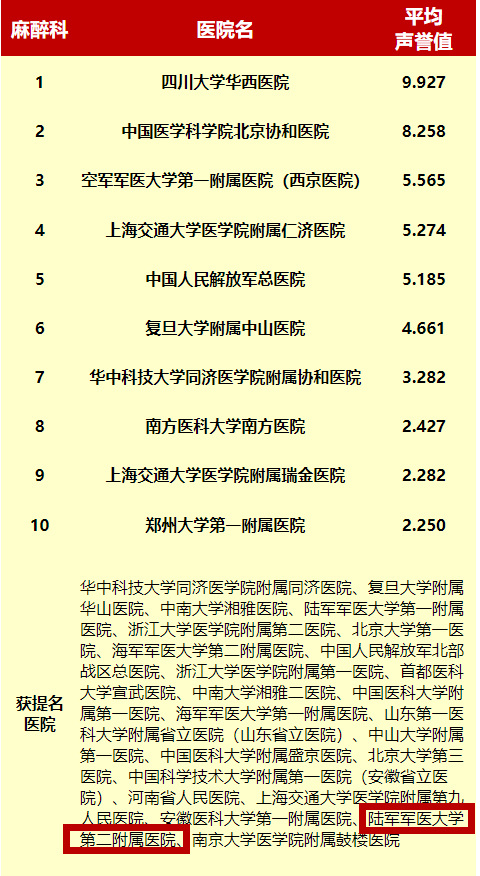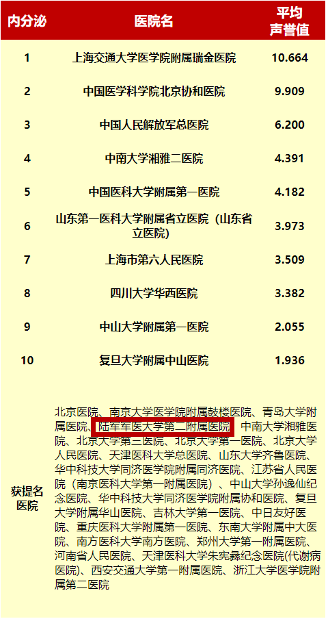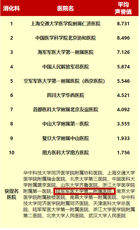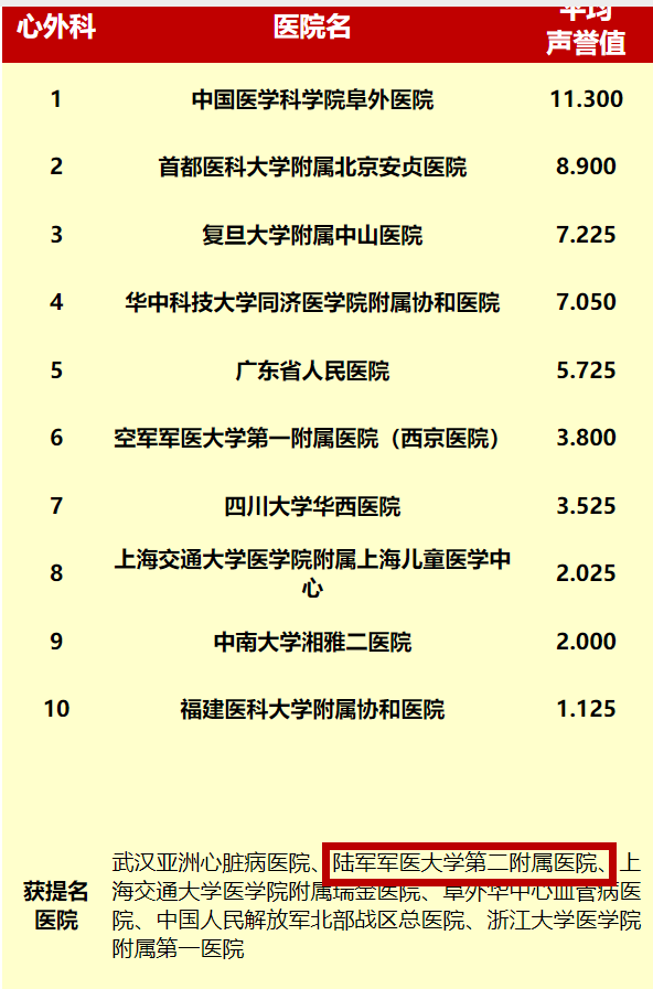 在西南地区专科声誉排行榜上,医院共10个学科上榜,其中血液科排名第1,心外科、消化科排名第2,呼吸科、内分泌科、心内科、骨科排名第3,麻醉科、超声科排名第5,另有神经内科、肾内科、普外科、神经外科、肿瘤科、胸外科、泌尿外科检验科等19个学科提名。