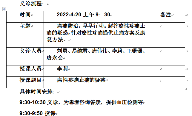 今年4月15日至21日是第28个全国肿瘤防治宣传周,主题是“癌症防治,早早行动”,活动旨在积极倡导每个人做自己健康的第一责任人,正确认识癌症、积极防控癌症,树立癌症三级预防理念,践行健康文明的生活方式,主动参加防癌健康体检,做到早预防、早发现、早诊断、早治疗,降低癌症发病率和死亡率,提高癌症早诊率和生存率,切实遏制癌症危害。为了让癌症病人远离疼痛,提高生活质量,陆军军医大学新桥医院疼痛康复医学科将于4月20日开展义诊活动。届时,来自疼痛康复医学科的专家团队将为广大市民提供义诊服务。