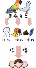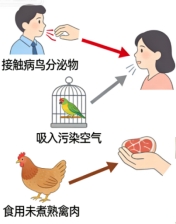 接触被病原体污染的环境,或密切接触受感染鸟类或禽类及其羽毛、组织、分泌物、排泄物等,或被感染的鸟类啄伤、抓伤时也可能经由破损皮肤、黏膜,以及消化道途径引发感染。