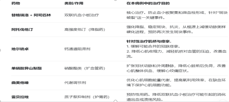 针对 “冠脉痉挛 + 肌桥 + 斑块破裂” 的复合病因,赵晓辉主任团队摒弃传统支架植入方案,制定了个体化精准药物治疗方案:采用替格瑞洛 + 阿司匹林双联抗血小板治疗,预防血小板聚集和微血栓形成;应用高强度他汀类药物阿托伐他汀强化降脂、稳定斑块;通过地尔硫卓缓解冠脉痉挛、减轻肌桥对血管的压迫;以单硝酸异山梨酯扩张冠脉、改善心肌供血;搭配曲美他嗪优化心肌能量代谢,同时辅以雷贝拉唑保护胃肠道,规避抗血小板治疗的潜在风险。经过系统治疗,患者症状迅速缓解,各项指标逐步恢复正常,现已康复出院,后续随访情况良好。