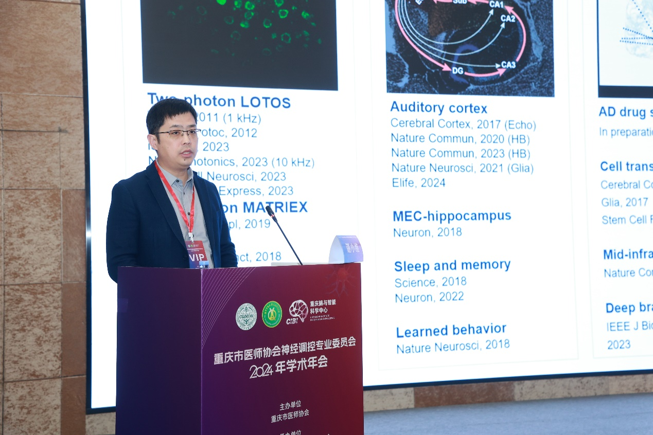 重庆脑与智能科学中心学术主任谌小维教授做学术报告《大脑网络解析和调节技术》。谌小维教授以“解析和调控大脑网络”为主题,深入讲解了如何运用双光子钙成像等尖端技术,探索听觉皮层、颞叶、海马等脑区中的记忆细胞和神经环路。谌教授团队发现了echo细胞、HB细胞以及胶质细胞在记忆形成与维持中可能发挥的关键作用。
