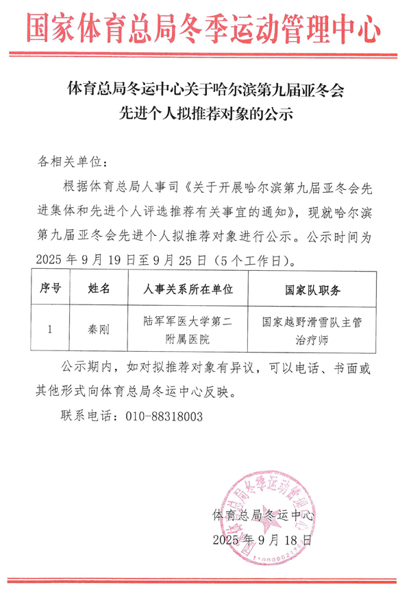 体育总局冬运中心关于哈尔滨第九届亚冬会先进个人拟推荐对象的公示