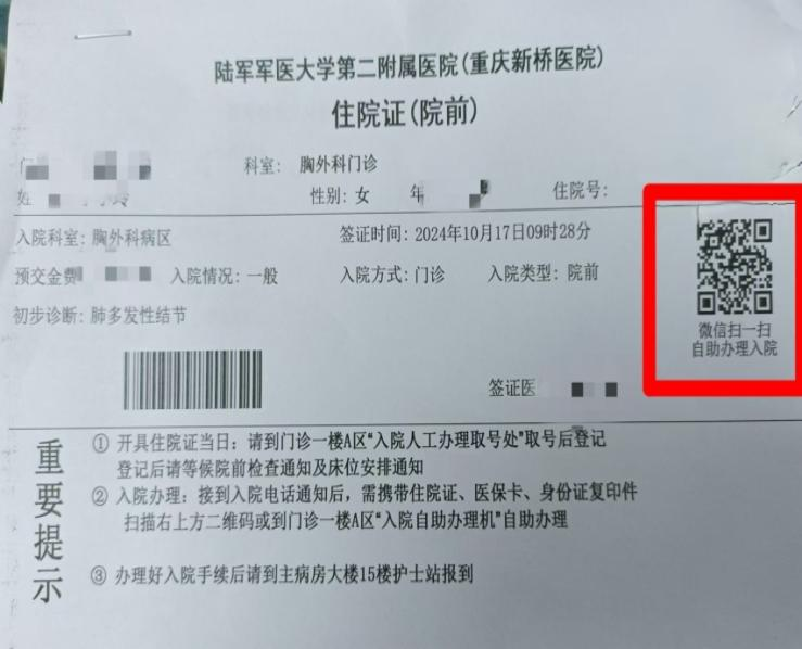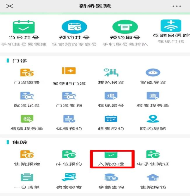 (1)手机自助办理:a、重庆新桥医院微信公众号;b、扫描“住院证”上微信二维码;进入界面后选择“入院办理”图标进入,按提示完善相关信息即可。