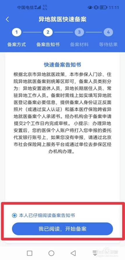 6、选中【本人已仔细阅读备案告知书】,点击【我已阅读,开始备案】按钮