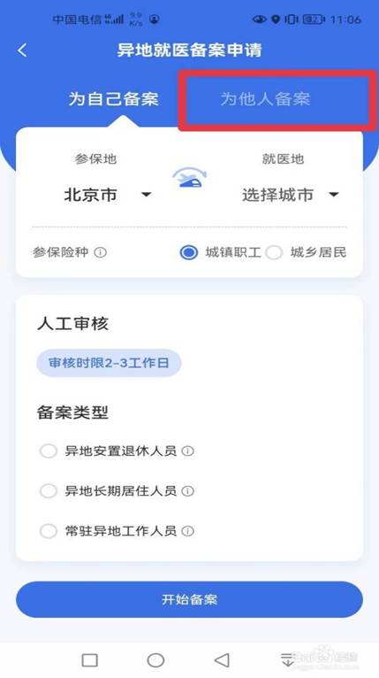 方法步骤与“为自己备案”相同,只需在备案一开始选择“为他人备案”