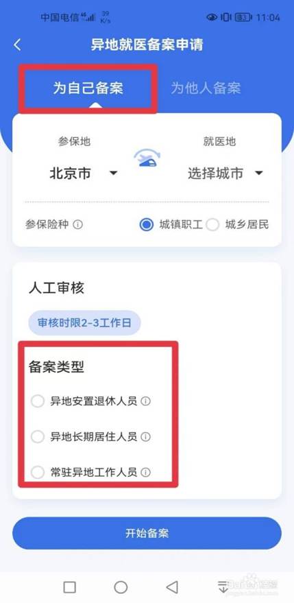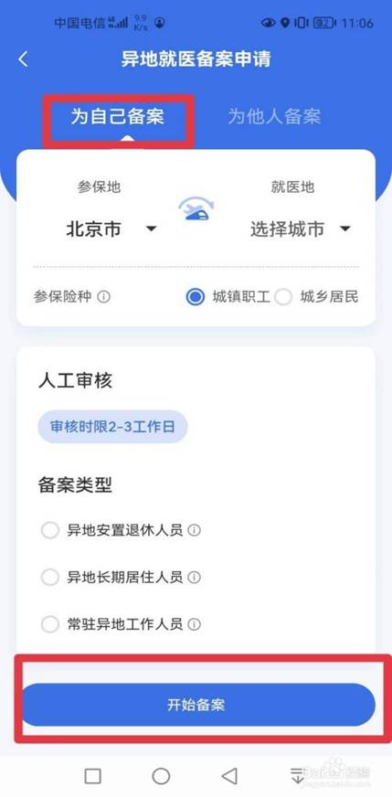 根据自己的实际情况,选择“参保地”、“就医地”、“参保险种”、“备案类型”