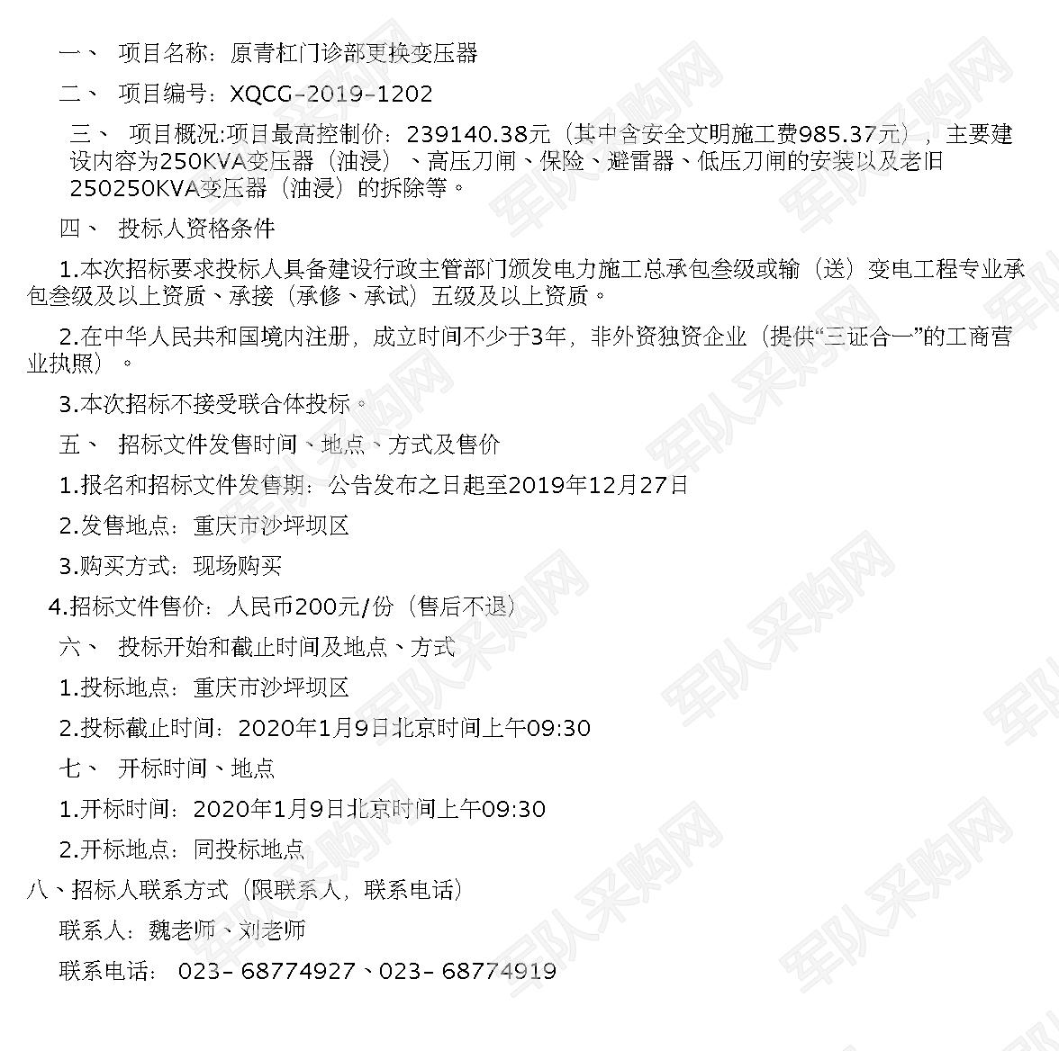 陆军军医大学第二附属医院采购公告-原青杠门诊部更换变压器