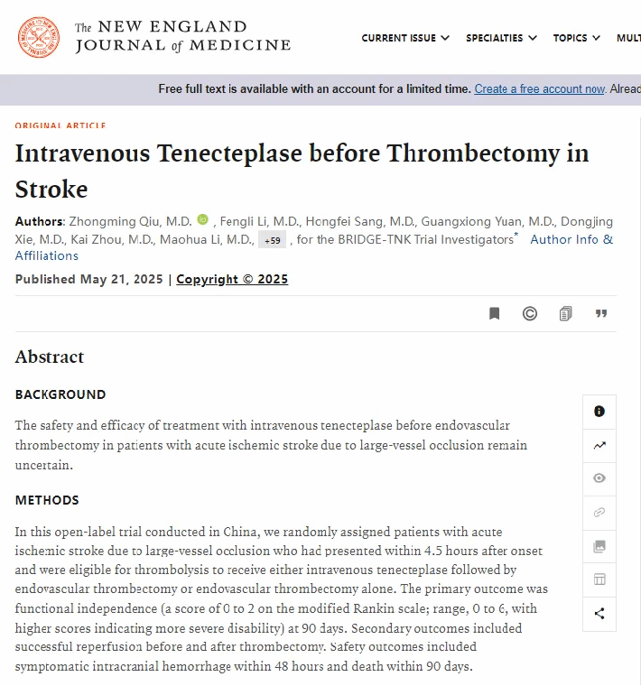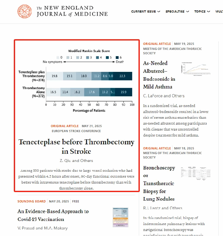 5月21日,陆军军医大学新桥医院神经内科杨清武教授和资文杰教授团队重磅研究成果《替奈普酶静脉溶栓联合取栓术对比单独取栓术治疗急性大血管闭塞性卒中的多中心随机对照试验(BRIDGE-TNK)》再次登顶国际顶尖医学期刊《新英格兰医学杂志》(NEJM),并同步于欧洲卒中组织会议(ESOC 2025)开幕式全体会议(北京时间5月21日15:59)向全球发布,引发轰动及国际学界关注!
