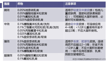(1) 外用糖皮质激素(TCS):是特应性皮炎的一线治疗用药。具有抗炎、抗过敏、抑制免疫、抗增生等作用。按照强度一般可分为四级(超强效、强效、中效、弱效,见下图)。