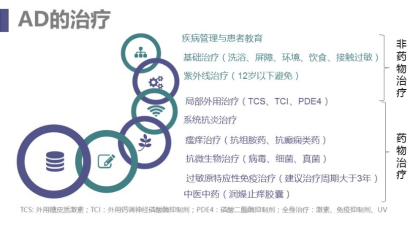 依据《中国特应性皮炎诊疗指南(2020版)》,特应性皮炎的治疗有很多方式,包括基础治疗、外用药物治疗、系统治疗、紫外线治疗、瘙痒的治疗、抗微生物治疗等。