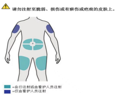 ② 注射部位应选择大腿或腹部(肚脐周围5cm以内的区域除外);如由他人进行注射,也可注射于上臂;建议每次注射轮换注射部位。