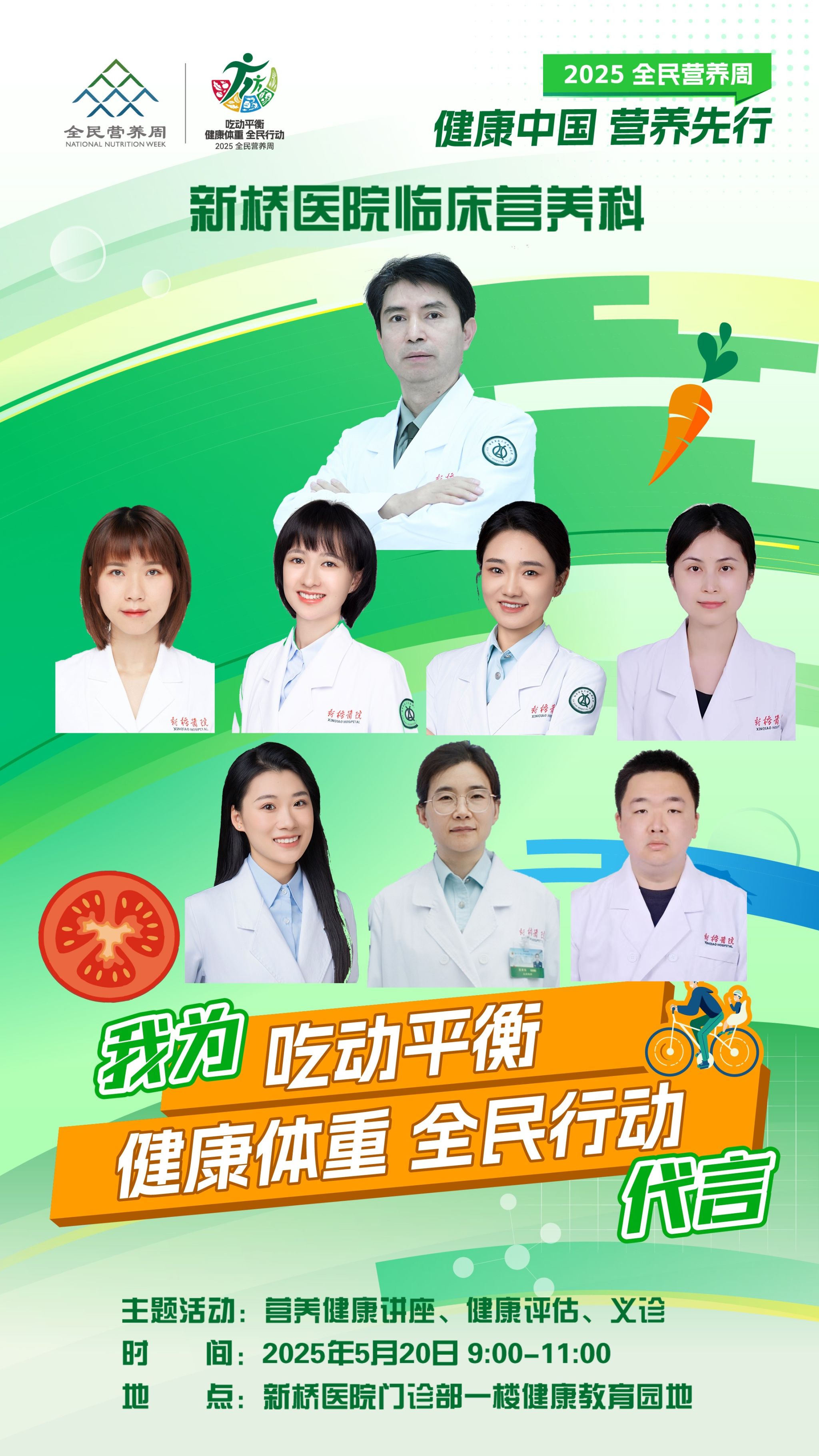5月20日上午,陆军军医大学第二附属医院临床营养科围绕2025年全民营养周 “吃动平衡,健康体重,全民行动”的主题成功开展义诊活动。本次活动通过健康科普、互动问答与专业义诊相结合的形式,吸引逾百名患者参与,激发了民众关注营养健康的热潮。