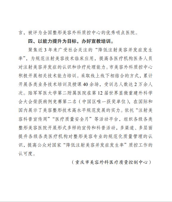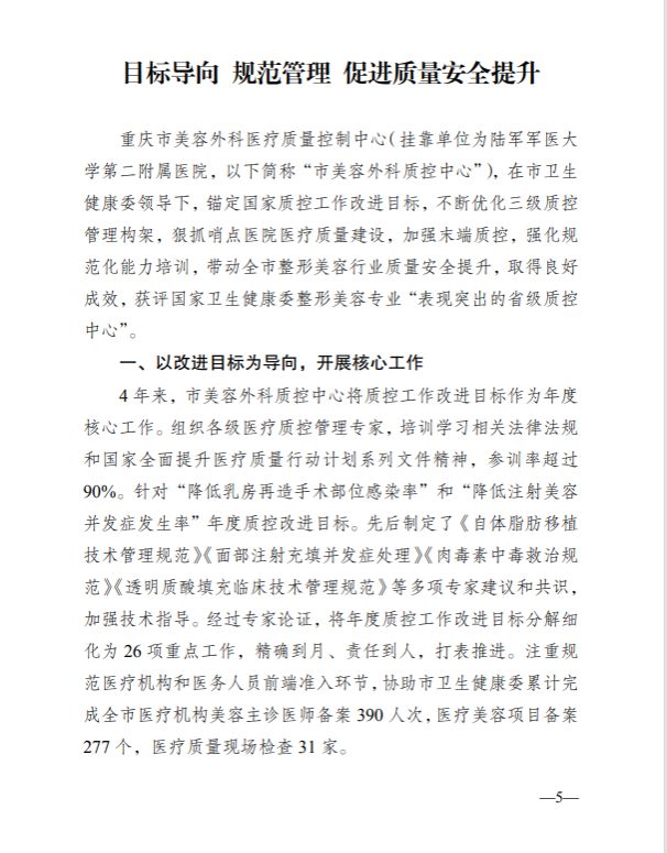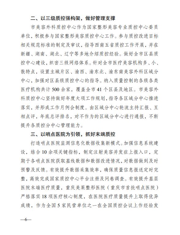 2024年4月,重庆市美容外科医疗质控中心(重庆新桥医院整形外科)的创新工作模式与规范化管理经验被《重庆卫生健康情况》专刊收录并刊发,成为全市医疗质量控制领域的示范标杆,为其他专业质控中心提供了可参考的实践路径。该中心以提升行业安全与服务质量为核心,通过完善技术标准、强化动态监管、推动信息化建设等多项举措,构建起覆盖医疗美容全流程的质控体系。例如,定期开展技术规范培训、细化医疗美容项目分级管理、实施医美机构联合督查等做法,有效提升了行业规范性与诊疗安全性。重庆市卫生健康委表示,这一经验推广将助力全市医疗美容行业高质量发展,进一步保障消费者健康权益,为全国医美质控工作提供“重庆样本”。