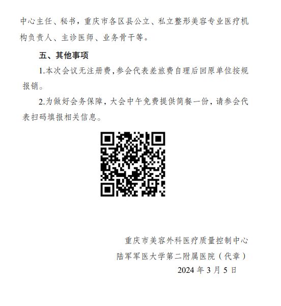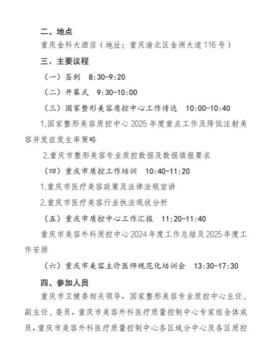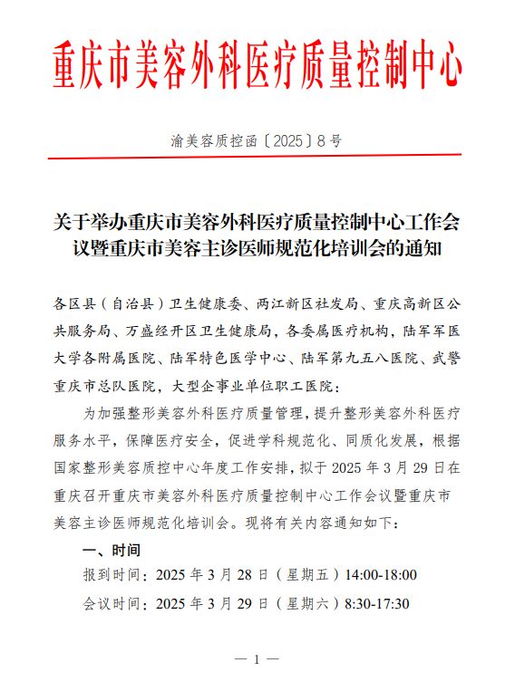 为推进医疗美容行业规范化发展,提升诊疗质量与安全,重庆市美容外科医疗质量控制中心将于2025年3月29日在重庆金科大酒店召开年度工作会议暨美容主诊医师规范化培训会。会议将围绕国家整形美容质控中心年度重点工作、医疗美容政策法规、行业执法现状及质控数据管理等议题展开,并发布重庆市2024年质控总结与2025年工作计划。国家及市级质控专家、医疗机构负责人、主诊医师等将参会学习交流,旨在通过政策宣贯、技术培训及跨区域协作,强化行业标准落实,降低医疗风险,为求美者提供更安全优质的医疗服务。